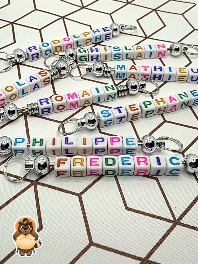 Porte-clé lettres personnalisables, tige métal et perles acrylique.